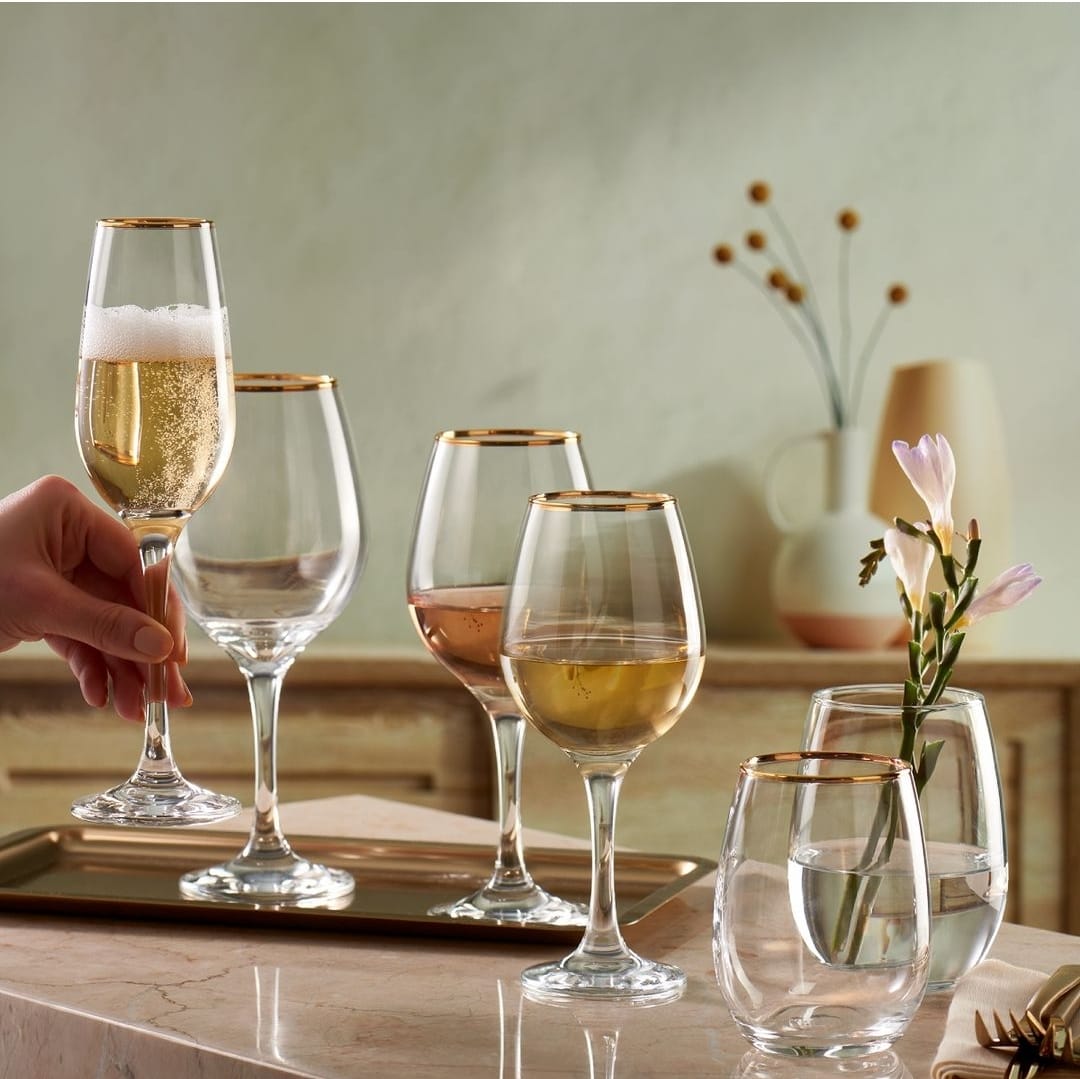 Pahare de sampanie din sticla cu margine aurie,ambalate in cutie de cadou,se vand multiplu de bax, disponibile in diferite moduri de ambalare: 24/bax.