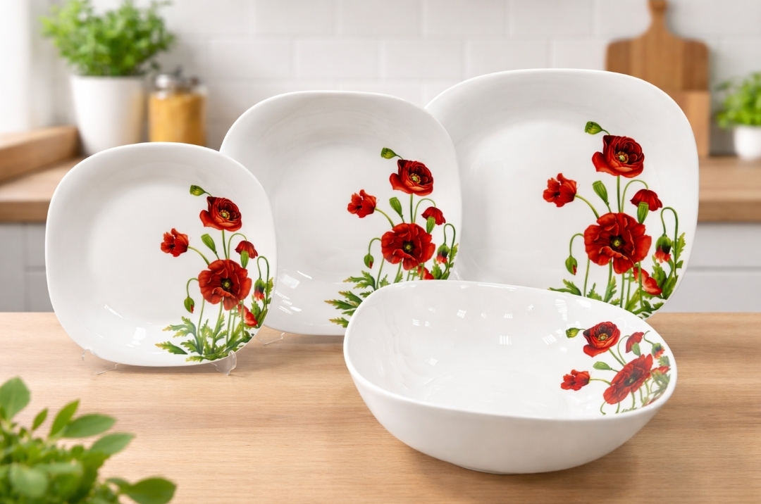 Serviciu de masa din arcopal 19pcs patrat cu model,ambalat in cutie de cadou,se vinde multiplu de bax:2/bax