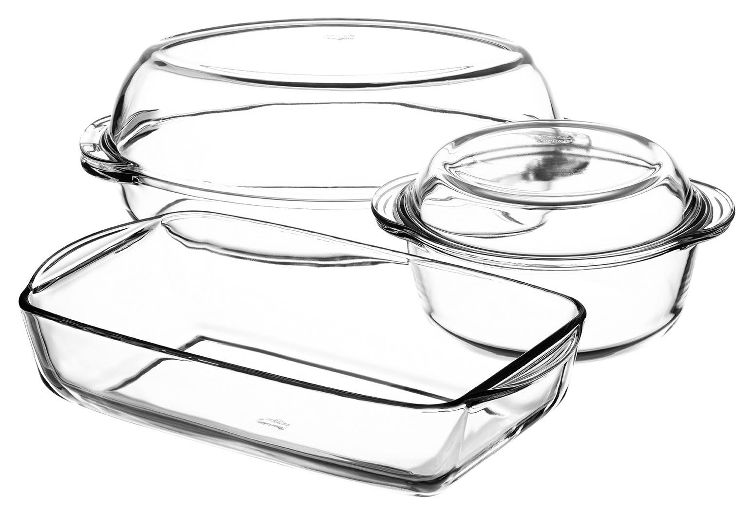 Set 3 vase(yena) din sticla barosilicata: rotund cu capac, oval cu capac si tava dreptunghiulara, capacitati : 1450cc + 2250cc + 2750cc.