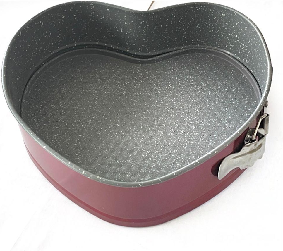 Forma prajitura inima cu mecanism de inchidere,fabricata din otel carbon,culoare interioara ;marmura(nu se lipeste),culoare exterioara;rosu,ambalat in cutie ,se vinde multiplu de bax:12buc/bax