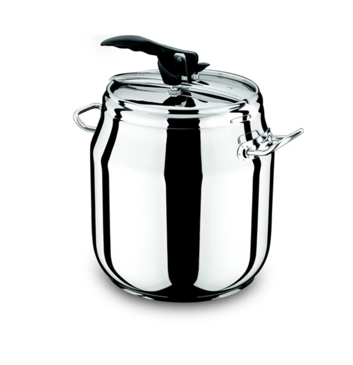 Oala cu presiune din inox inoxidabil, cu manere solide,capac pentru oala cu sistem de siguranta in 3 etape, fund cu inductie pentru utilizarea in toate tipurile de aragazuri. Finisaj argintiu lucios,ambalata in cutie,se vinde multiplu de bax:2/bax