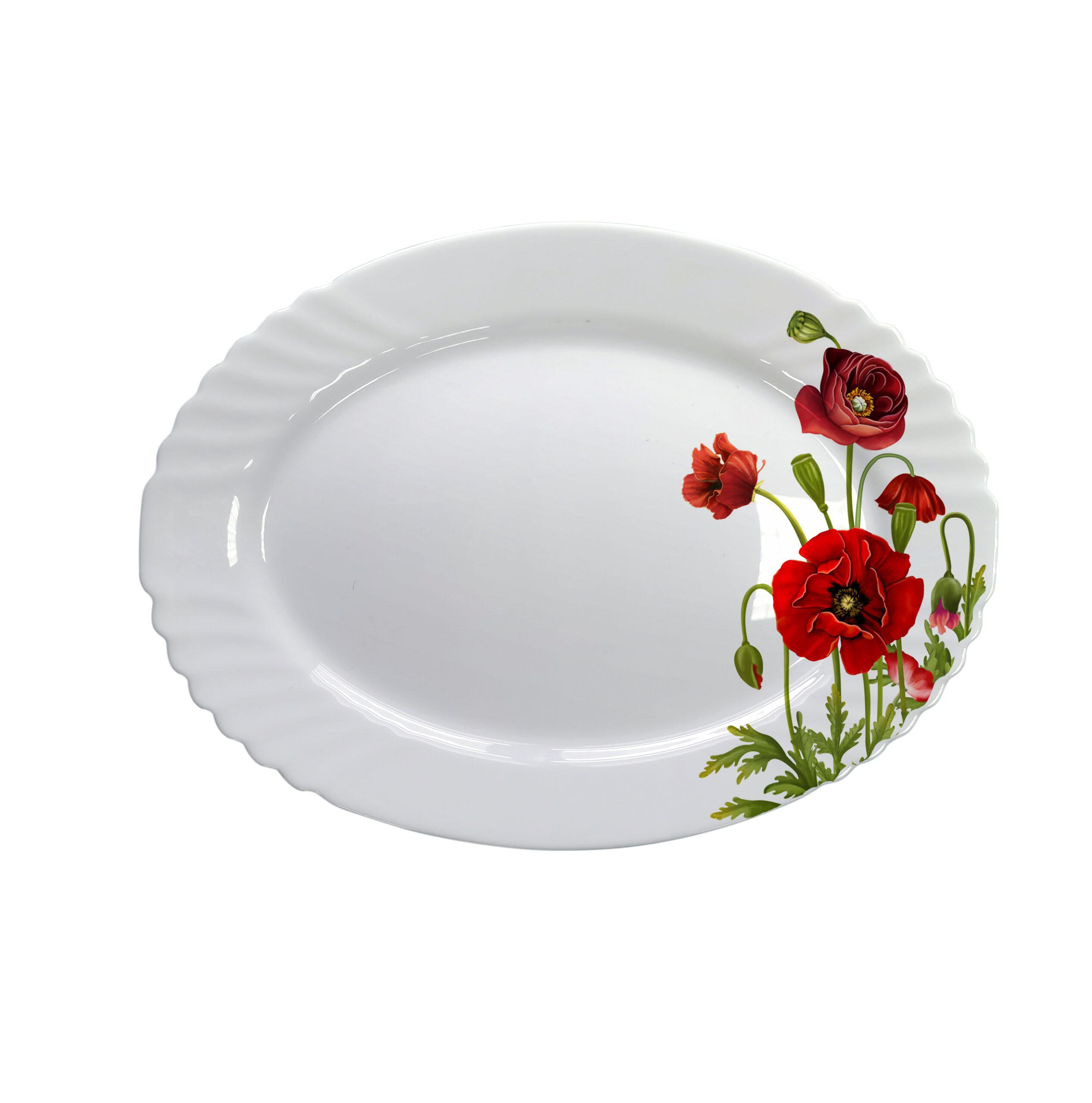 Platou oval cu decor realizat din sticla temperata,opal,perfect pentru pregatirea mesei,poate fi spalat la masina de spalat vase,poate fi introdus in cuptorul cu microunde,ambalat in cutie de cadou;6buc,se vinde multiplu de bax;24buc /bax