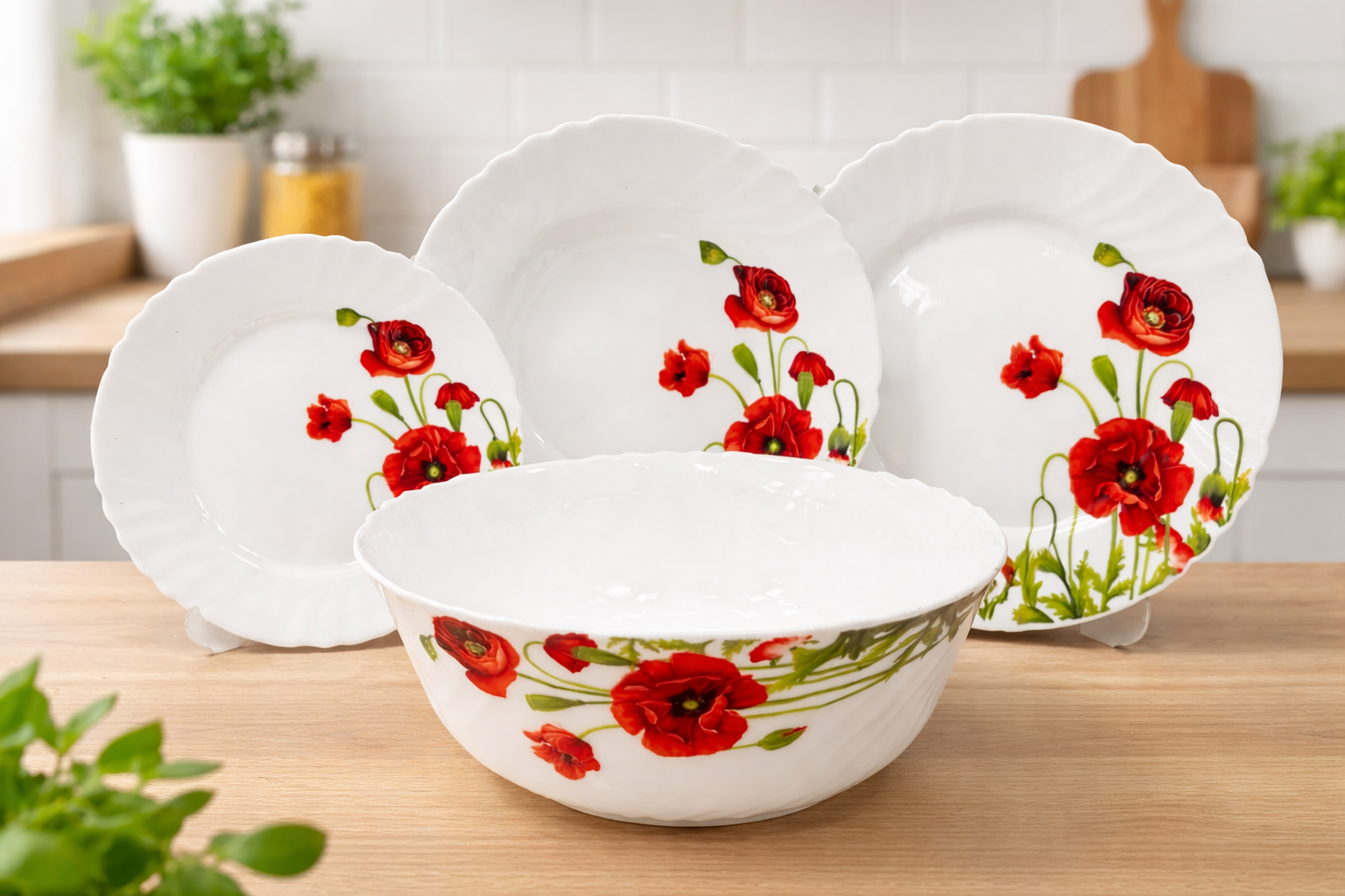 Serviciu de masa din arcopal 19pcs cu model,ambalate in cutie de cadou,se vand multiplu de bax:2/bax