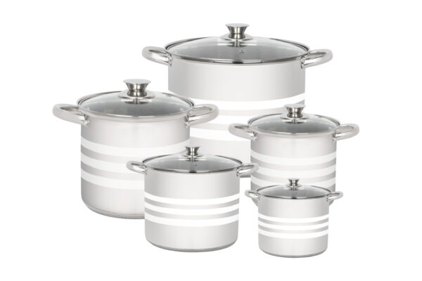 SWAN set inox 10pcs din otel inoxidabil ,format din 5oale+5capace din sticla+tigaie cu invelis antiaderent ,manere elegante si un design minimalist,fund triplu stratificat ,poate fi folosit pe toate sursele de gatit,curatare usoara,ambalat in cutie de cadou se vinde mltiplu de bax/2set.