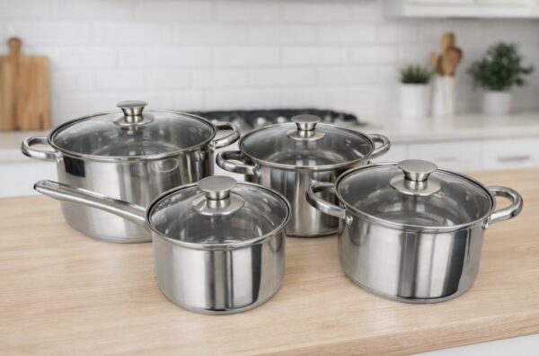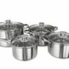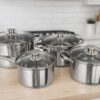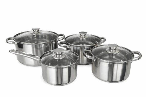 SWAN set inox 6pcs din otel inoxidabil ,format din 4oale+4capace din sticla+tigaie cu invelis antiaderent ,manere elegante si un design minimalist,fund triplu stratificat ,poate fi folosit pe toate sursele de gatit,ambalat in cutie de cadou se vinde mltiplu de bax/2set.