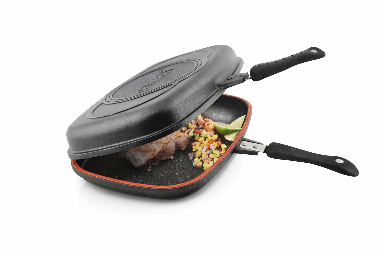 Grill dublu, cu invelis de marmura si garnitura de silicon cu inchidere ermetica pentru pregatirea alimentelor la abur , are manare magnetice,sunt disponibile mai multe dimensiuni,ambalat in cutie de cadou, se vinde multiplu de bax: 6/bax